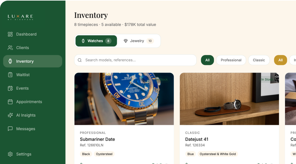 Yes. Luxare is purpose-built for the jewelry and watch industry, with dedicated workflows for Rolex Authorized Dealers and authorized service centers. From serialized inventory management and customer purchase records to integrated repair workflows and audit-ready documentation, Luxare provides the precision and accountability that Rolex dealership operations require across the US and Canada.